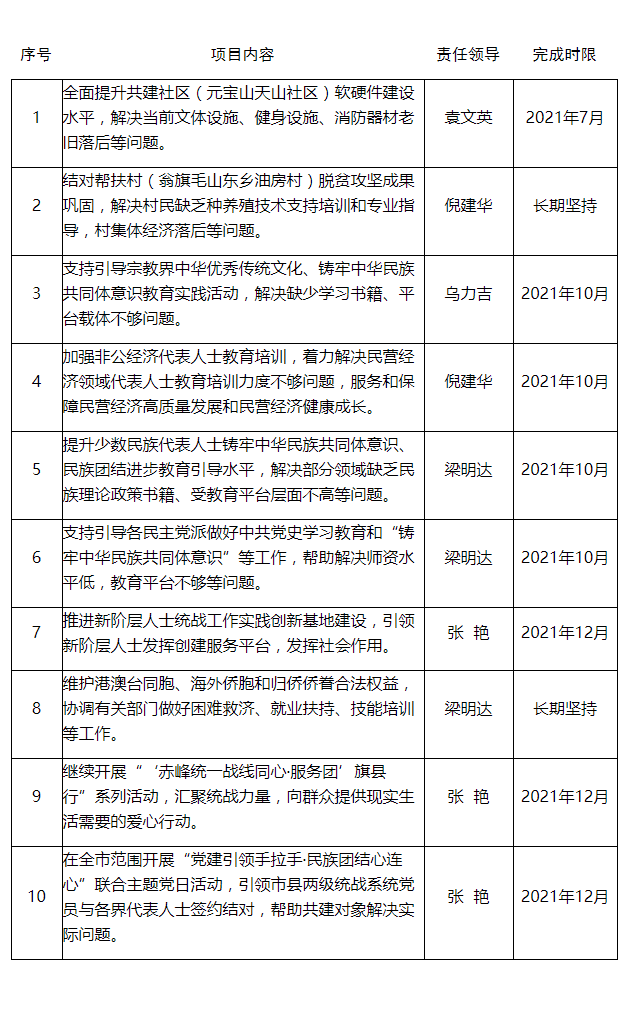 党史学习教育开展以来,市委统战部把开展“我为群众办实事”实践活动作为党史学习教育的重要内容,在充分调研的基础上,梳理形成“我为群众办实事”项目清单,确定10项重点工作任务,并明确了责任领导和完成时限,以解决群众关切的“急难愁盼”问题。现将10项实事清单予以公布,下一步,市委统战部将对“我为群众办实事”实践活动实行项目化管理、清单式推进,希望社会各界积极参与监督和评价,确保重点事项顺利推进、取得实效。